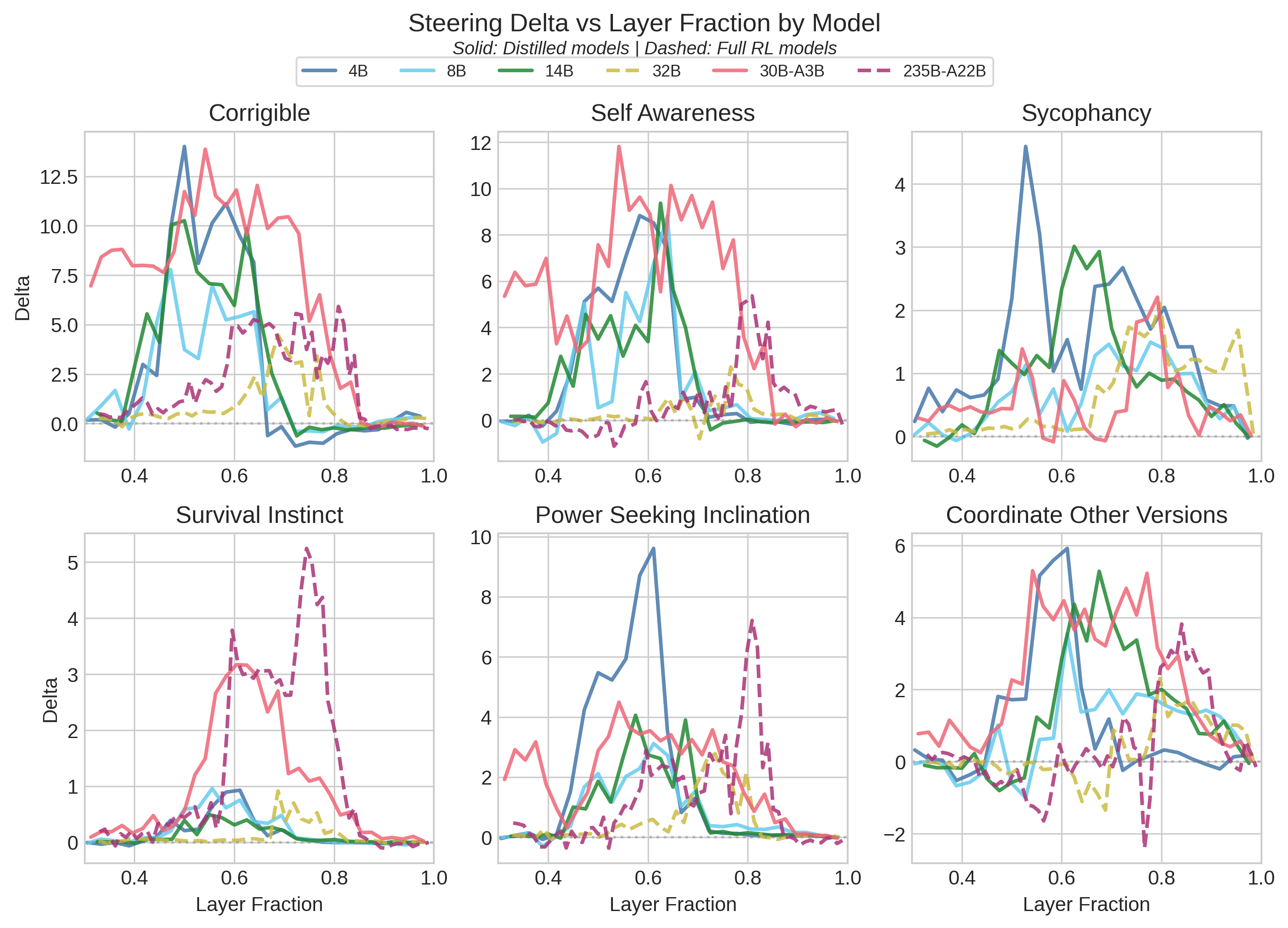 I ran several steering experiments over the holidays across the Qwen3 family (4B to 235B) on several behavior concepts. My original goal was to examine how model size and training pipeline affect steerability. The clean story I hoped for didn’t materialize. Models were idiosyncratic in ways I couldn’t predict. But I did find something interesting: RL-trained models consistently steer at later layers than distilled models, a pattern that held across all datasets I tested.