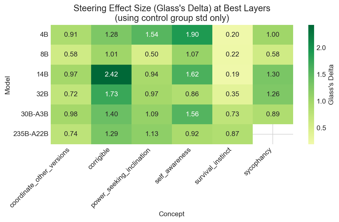 The 8B model stands out as consistently harder to steer (effect size 0.675, versus 1.036 for the next lowest). The 14B is an outlier in the other direction. Neither follows an obvious pattern by size or training method.