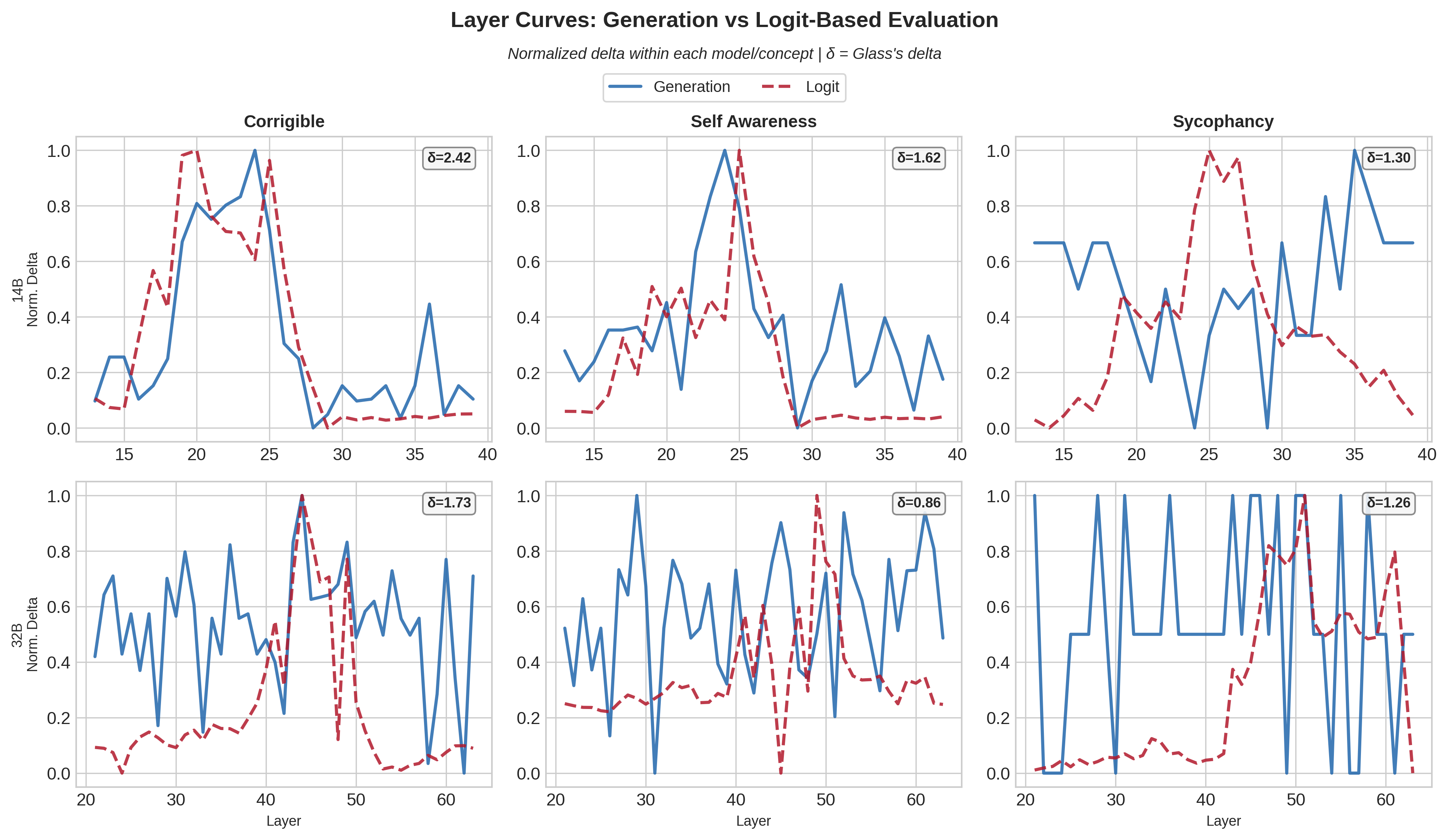 The two methods agree reasonably well for some dataset/model pairs. Corrigibility and self-awareness show similar layer curves. Others are much noisier or produce opposite layer selections. Sycophancy is the clearest divergence: comparable logit-diff effect sizes to other concepts but negligible or incoherent generation-based steering.
